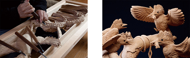 井波地處富山縣西南地區的礪波平野南端,當地民家星羅棋布,形成「散居村」。其為14 世紀末建成的井波別院瑞泉寺的門前町,至今依舊繁榮昌盛。井波雕刻據說起源於18 世紀中期,瑞泉寺的本堂燒毀,重建時從京都請來的御用雕刻師將技術傳授給井波的工匠。自寺院雕刻培養出的圓雕及深雕技術,現在廣泛用於鏤刻格窗、擺飾等。